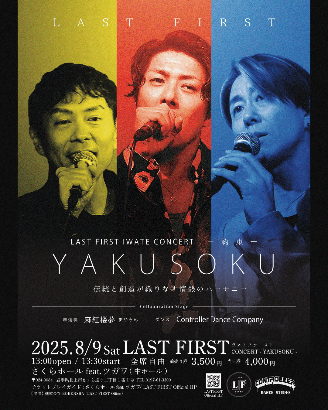 『LAST FIRST IWATE CONCERT ~YAKUSOKU~』【出演情報】 WORKS 2025.08.09 目次 日程会場チケット出演者お問い合わせ 日程 2025年8月9日 open13:00/start 13:30 会場 さくらホ-ルfeat.ツガワ(中ホ-ル)岩手県北上市さくら通り2丁目1番1号 チケット ※全席自由前売り 3500円/当日 4000円 出演者 LAST FIRST サポートギタリスト:海津信志 他 お問い合わせ